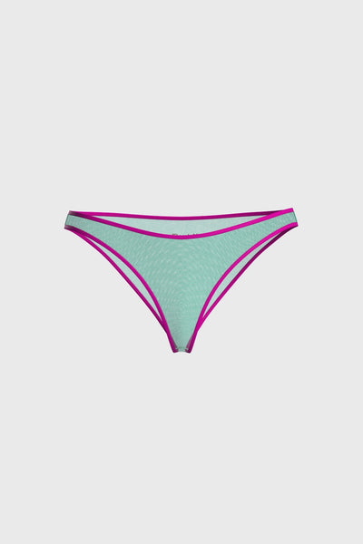 Chilot din tul pastel transparent, evidentiat cu elastic fluorescent ultra-plat in talie. Croiala usoara si confortabila. Logo Maison Close in contrast, plasat la spate. Fara captuseala de bumbac pentru un efect complet transparent.